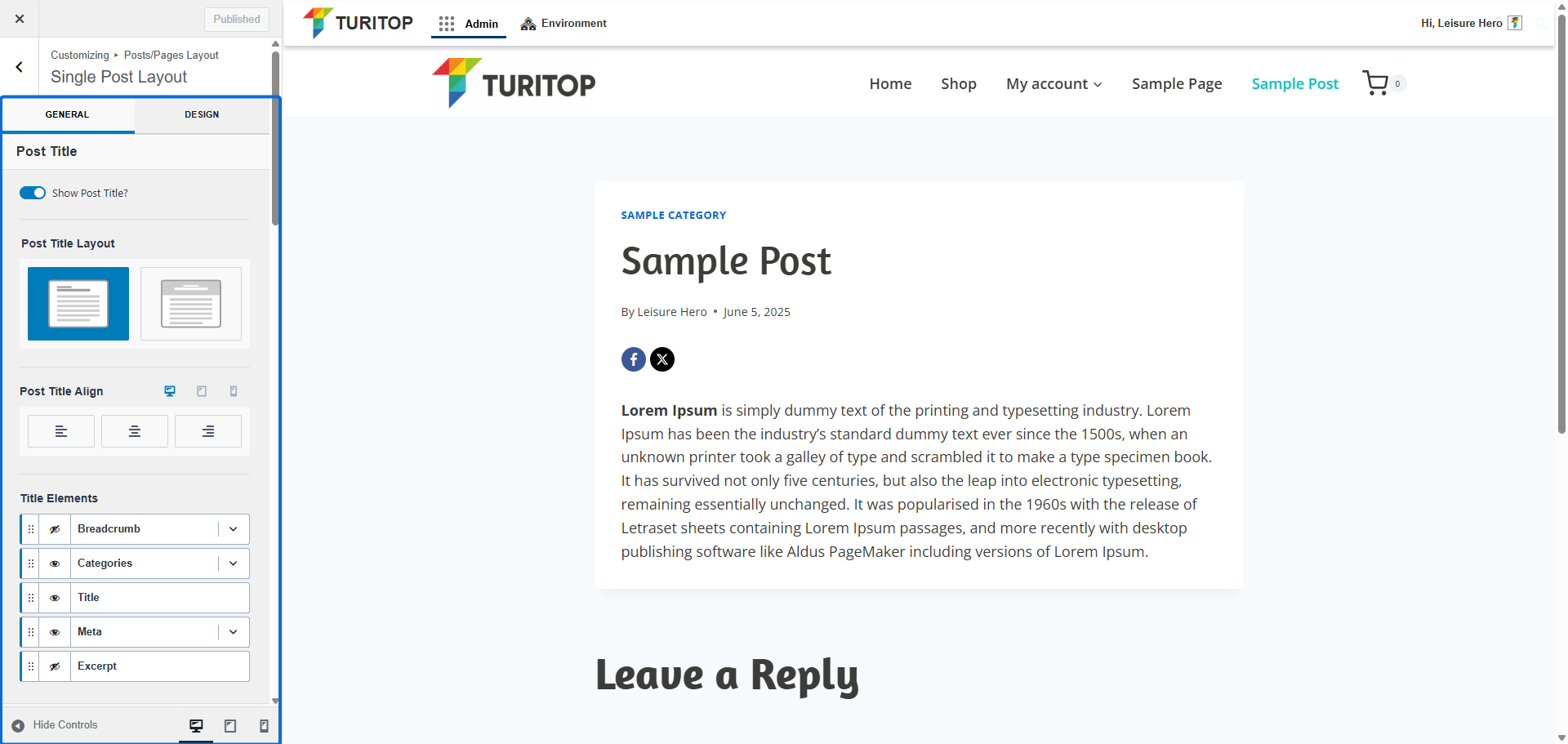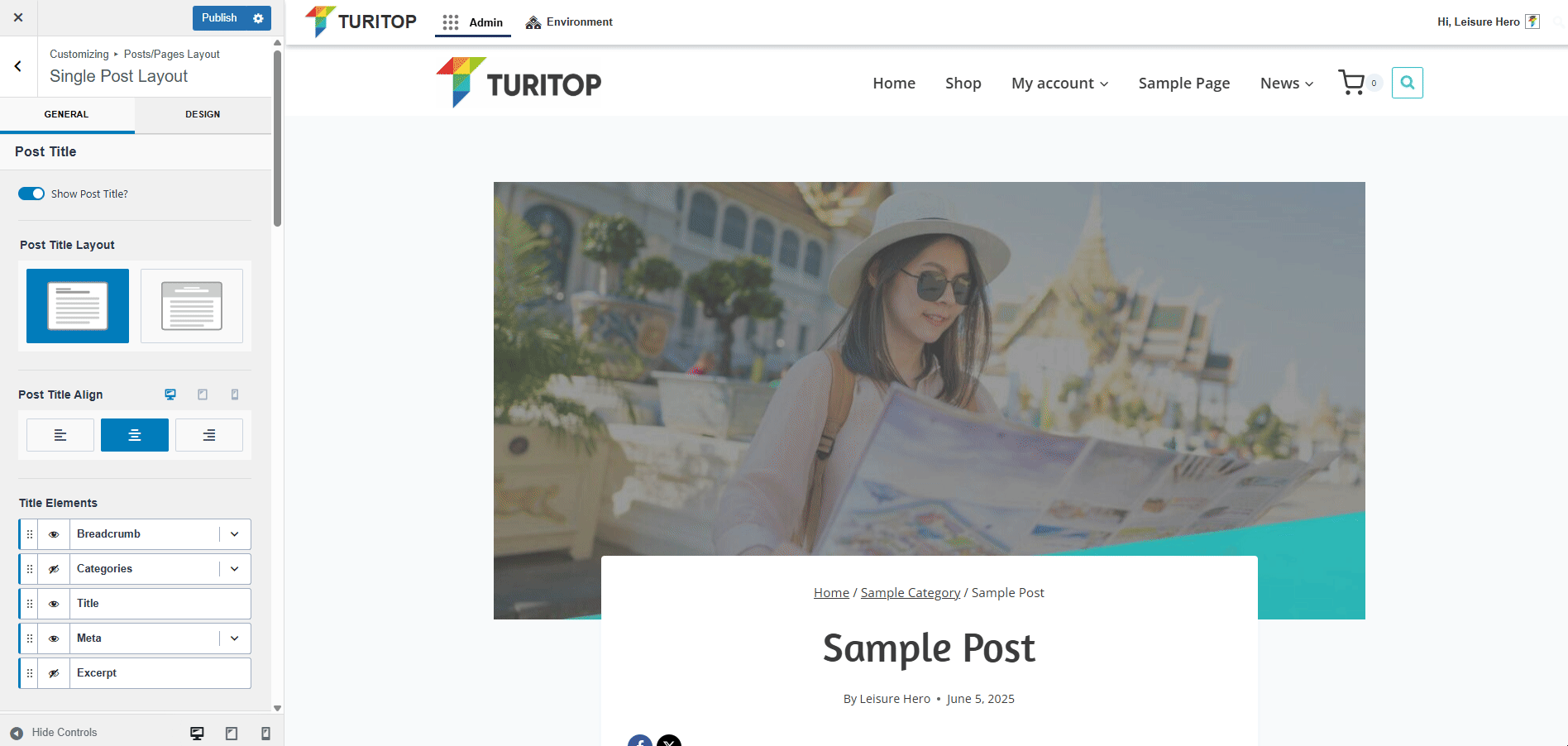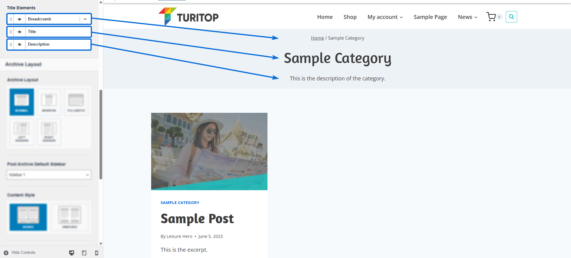 - Breadcrumb: If shown, you will be able to configure to “Show Post Title in Breadcrumb” or leave it hidden (ie. the post title will be shown or not at the end of the breadcrumb).