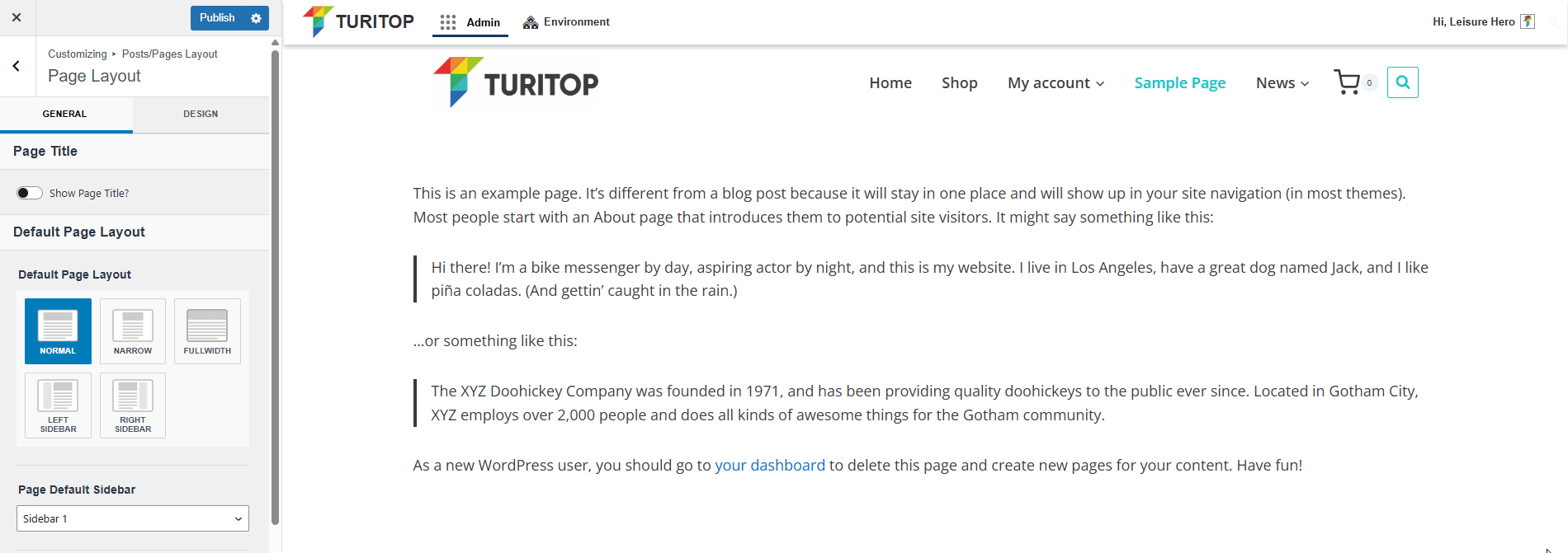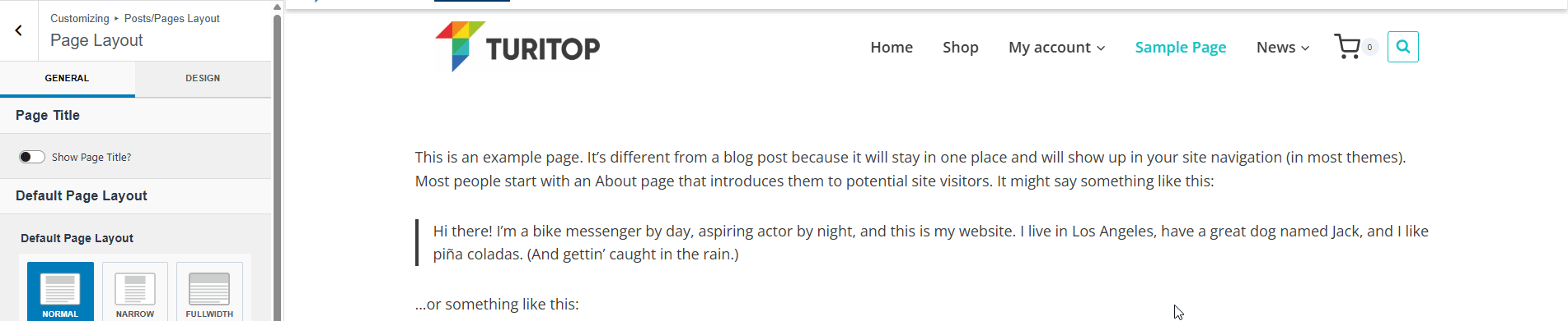 In a fresh installation, the Default Page Layout is set to Normal. However, you can switch between the available layouts: