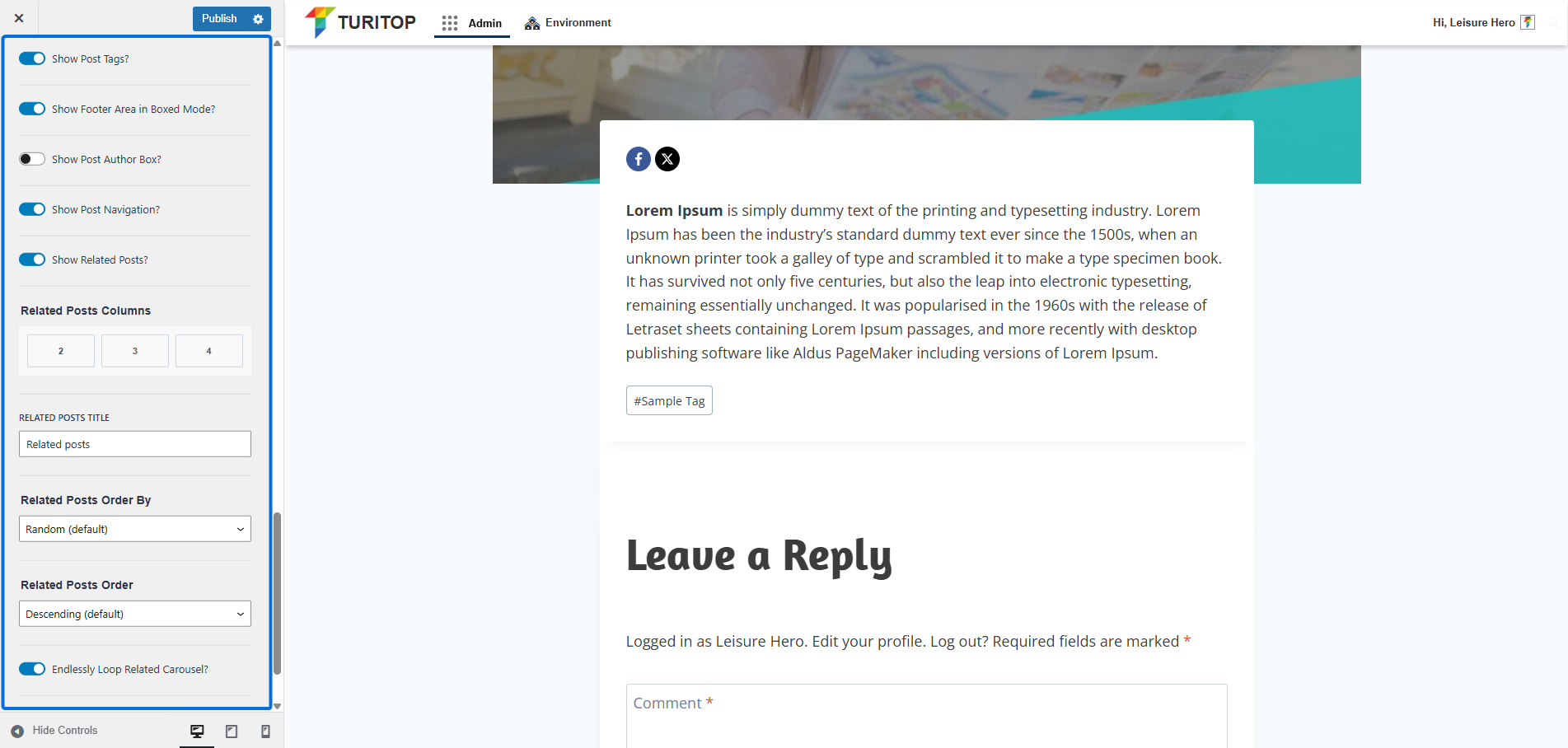 - Show Related Posts: If enabled, a list of related posts will be shown at the end of the post. You will be able to configure the Related Posts Columns (2 to 4), the Related Posts Title, the Related Posts Order By (Random, per ID, per Author, per Title, and so on), and the Related Posts Order (Descending or Ascending).