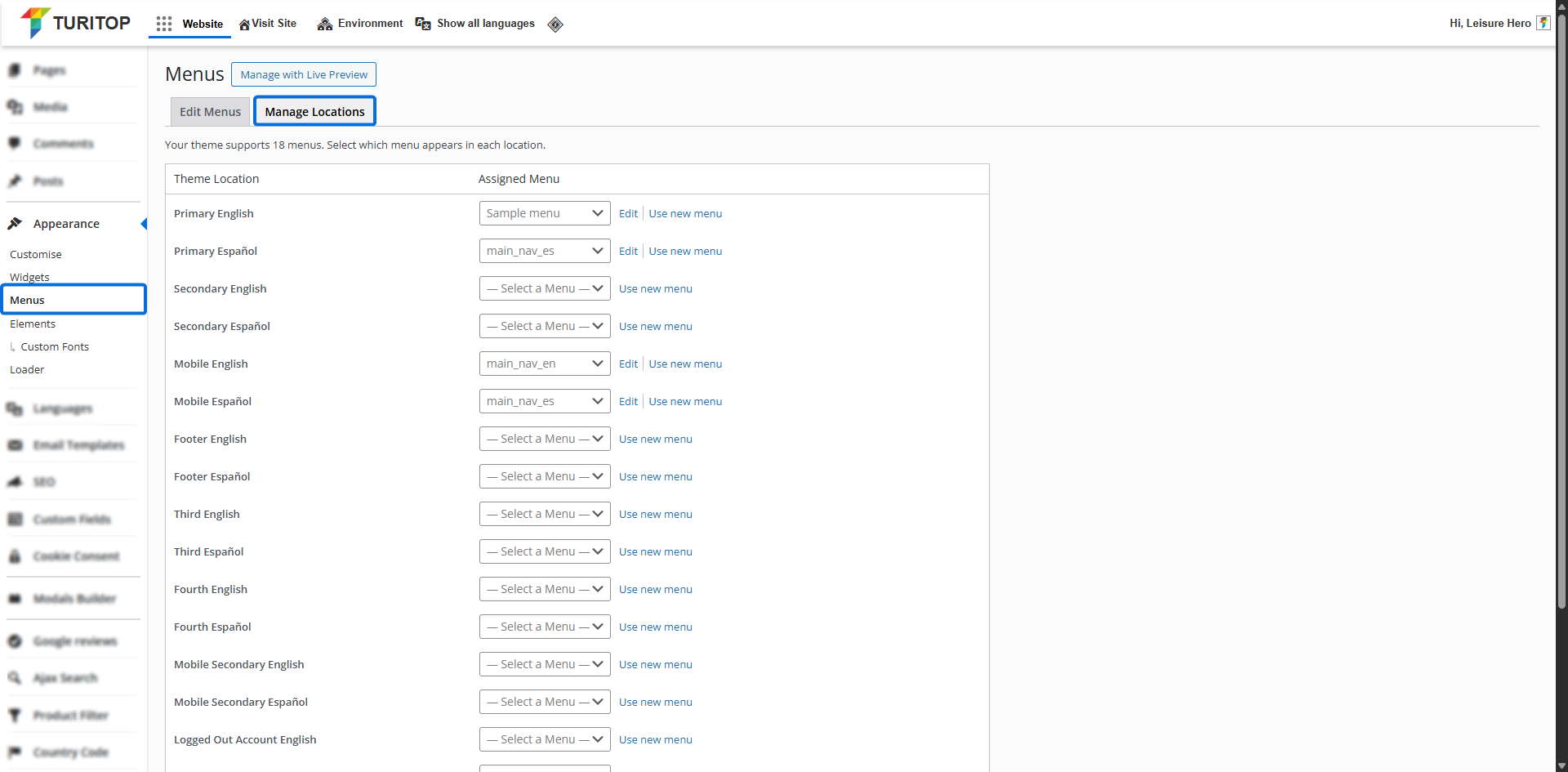 Note that if you are using a multilingual site (like the example above), there will be an independent location for each language. This way, you can configure specific translated menus for your different languages.