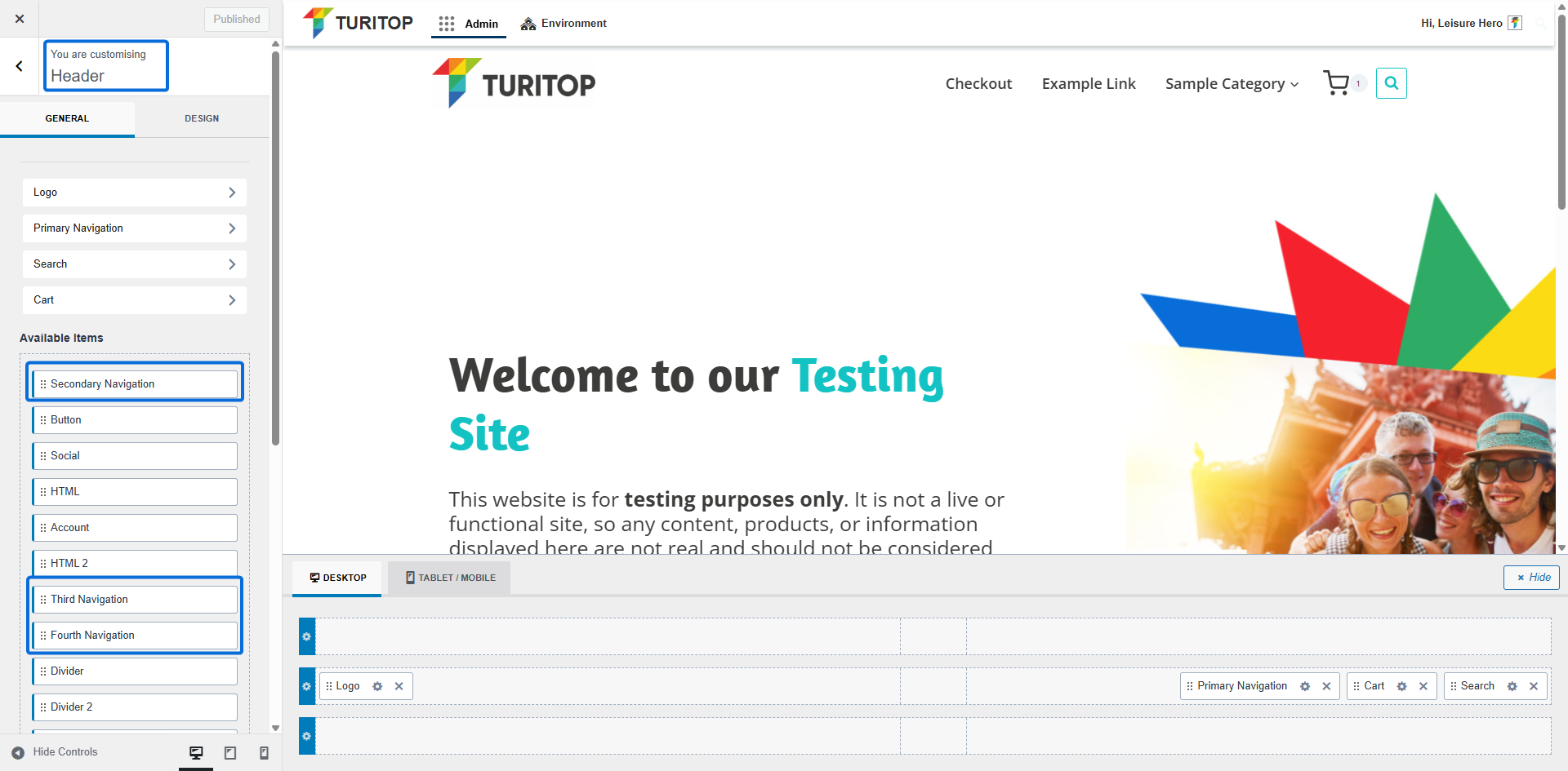 The “Mobile Navigation” and “Mobile Navigation 2” items will not appear if yo do not switch to the Tablet/Mobile view.
