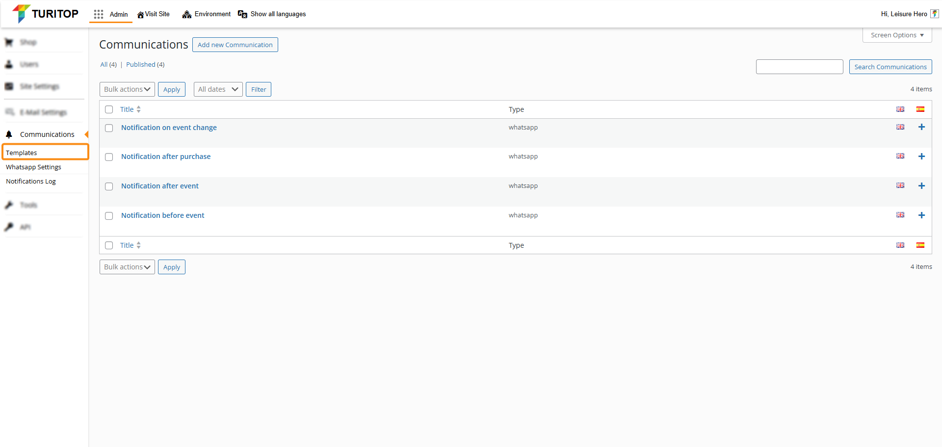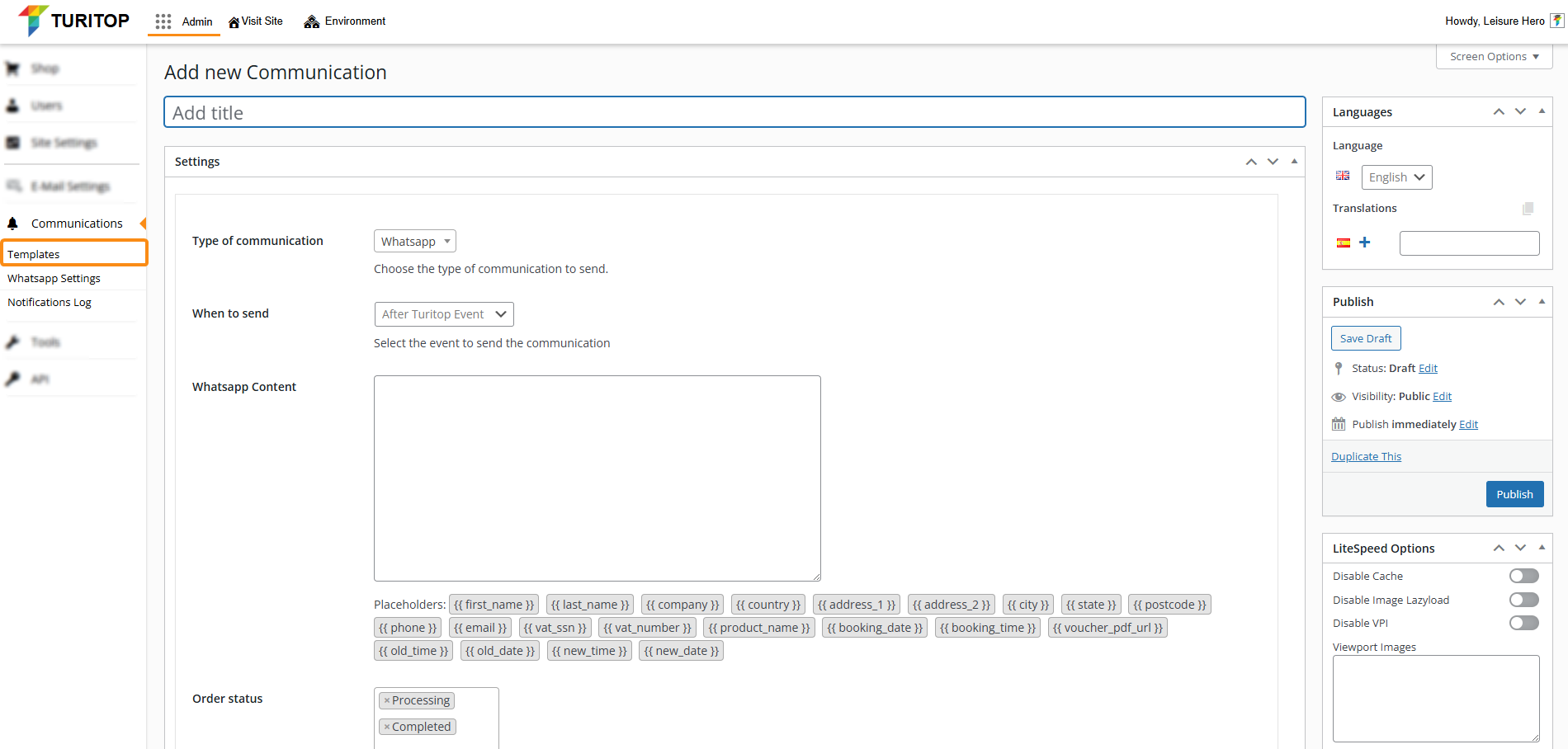 Admin >>> Communications >>> Templates >>> Add new Communication
