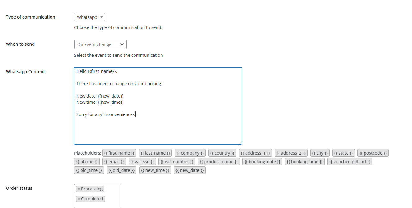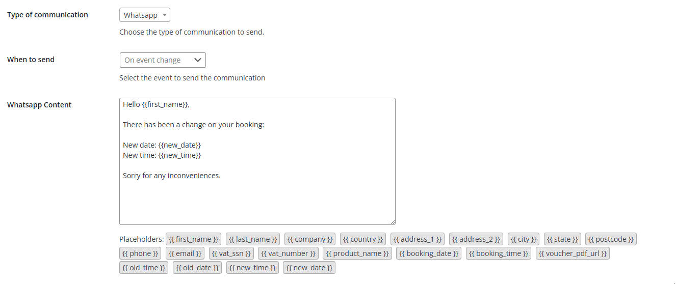 - WhatsApp content: In this text box, you can customize the message that will be sent to your clients. You can format your text using Markdown and insert several information about the booking using the available placeholders: