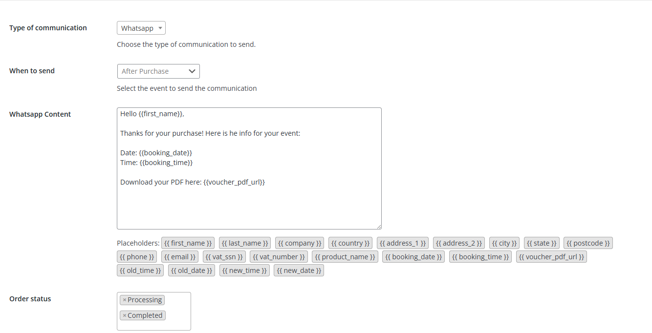 - Order status: Choose the different statuses of the order to send the communication (by default, “Processing” and “Completed”).