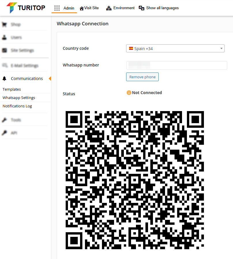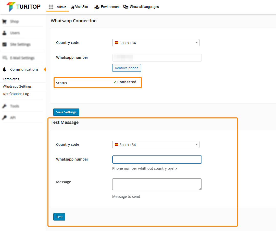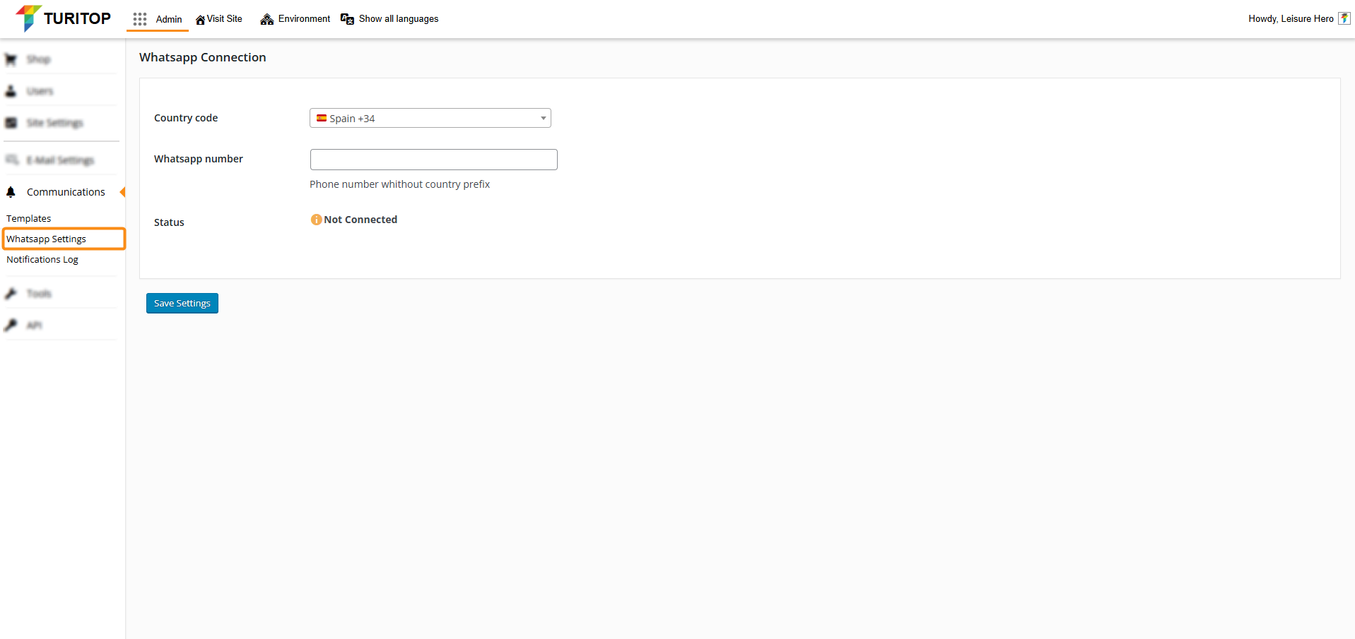 Admin >>> Shop >>> Communications >>> Whatsapp Settings