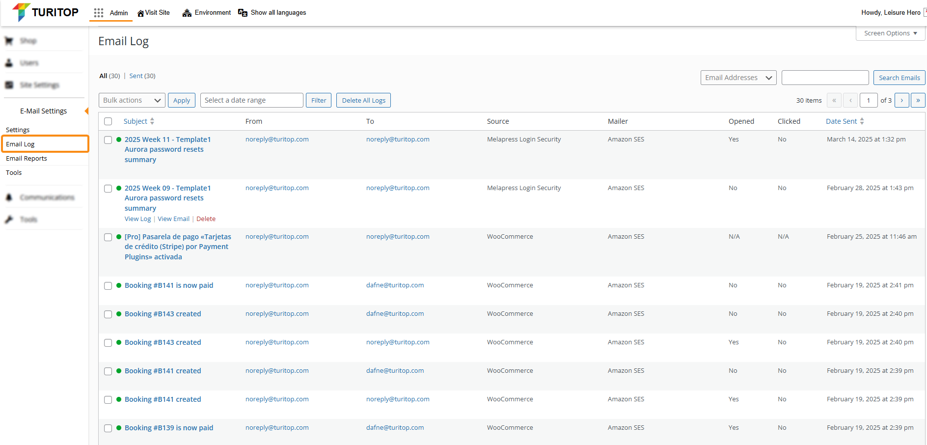 In this view, you can check your Email Log to find every email sent through your shop/site. It allows you to see the following fields of emails sent: