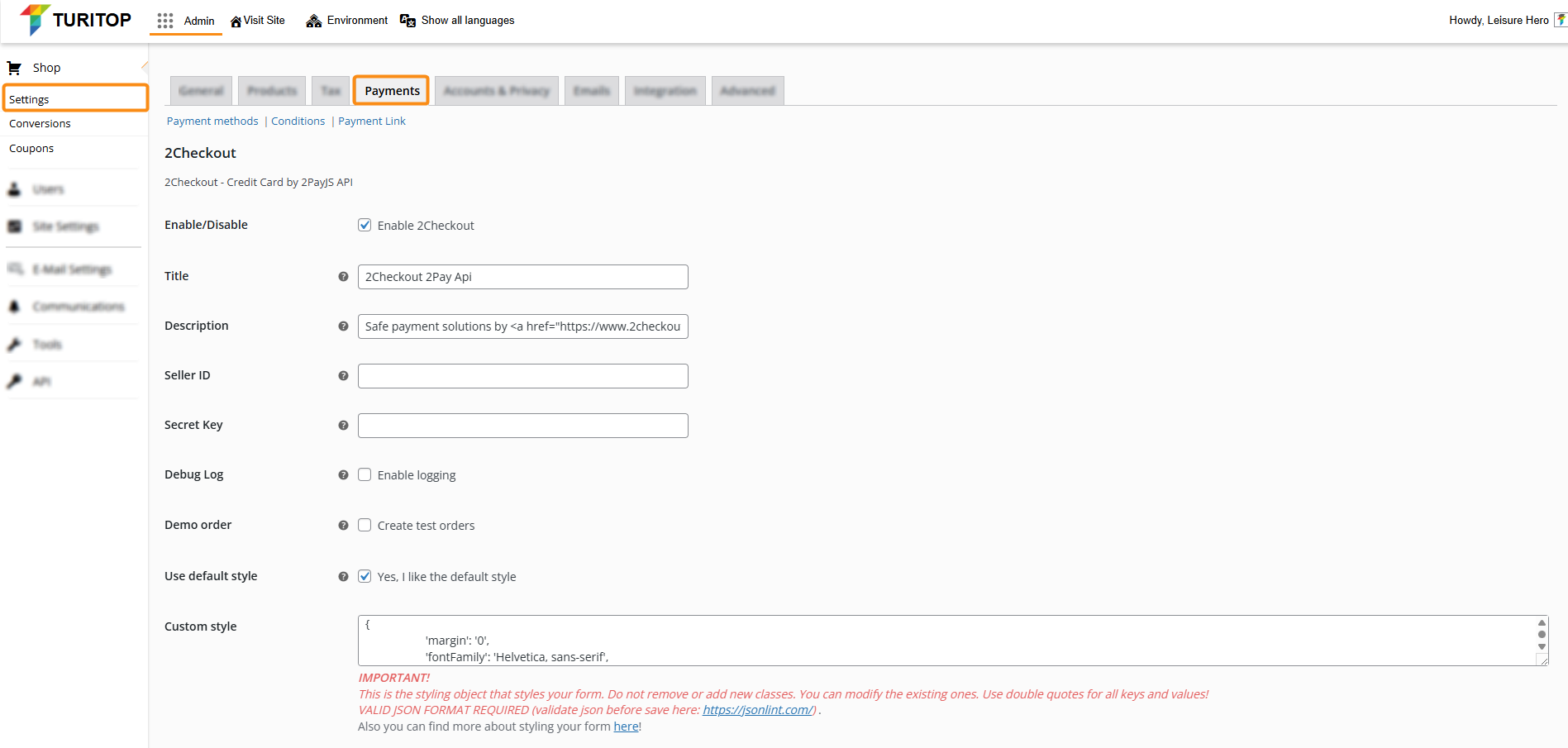 Admin >>> Shop >>> Settings >>> Payments >>> 2Checkout 2Pay Api