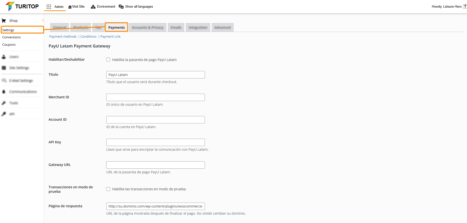 Admin >>> Shop >>> Settings >>> Payments >>> PayU Latam