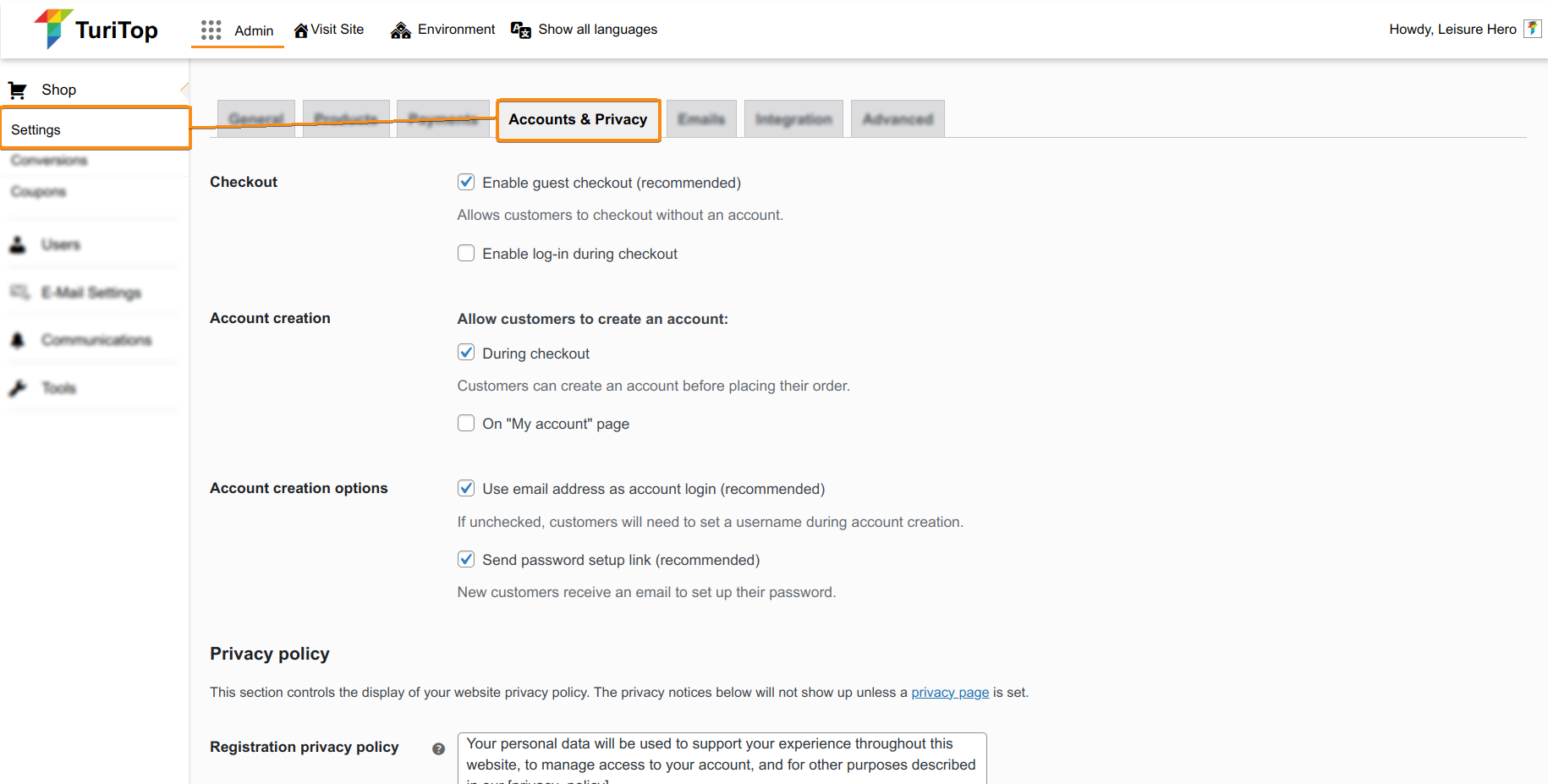 Admin  >>> Shop >>> Settings >>> Accounts & Privacy