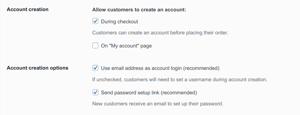 • Use email address as account login: Customers will need to set a username during account creation if unchecked.