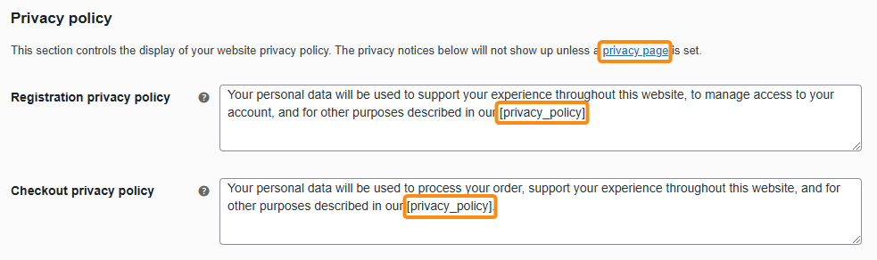 This section lets you select a page for your privacy policy and display privacy policy snippets on the account and checkout pages shown to customers.