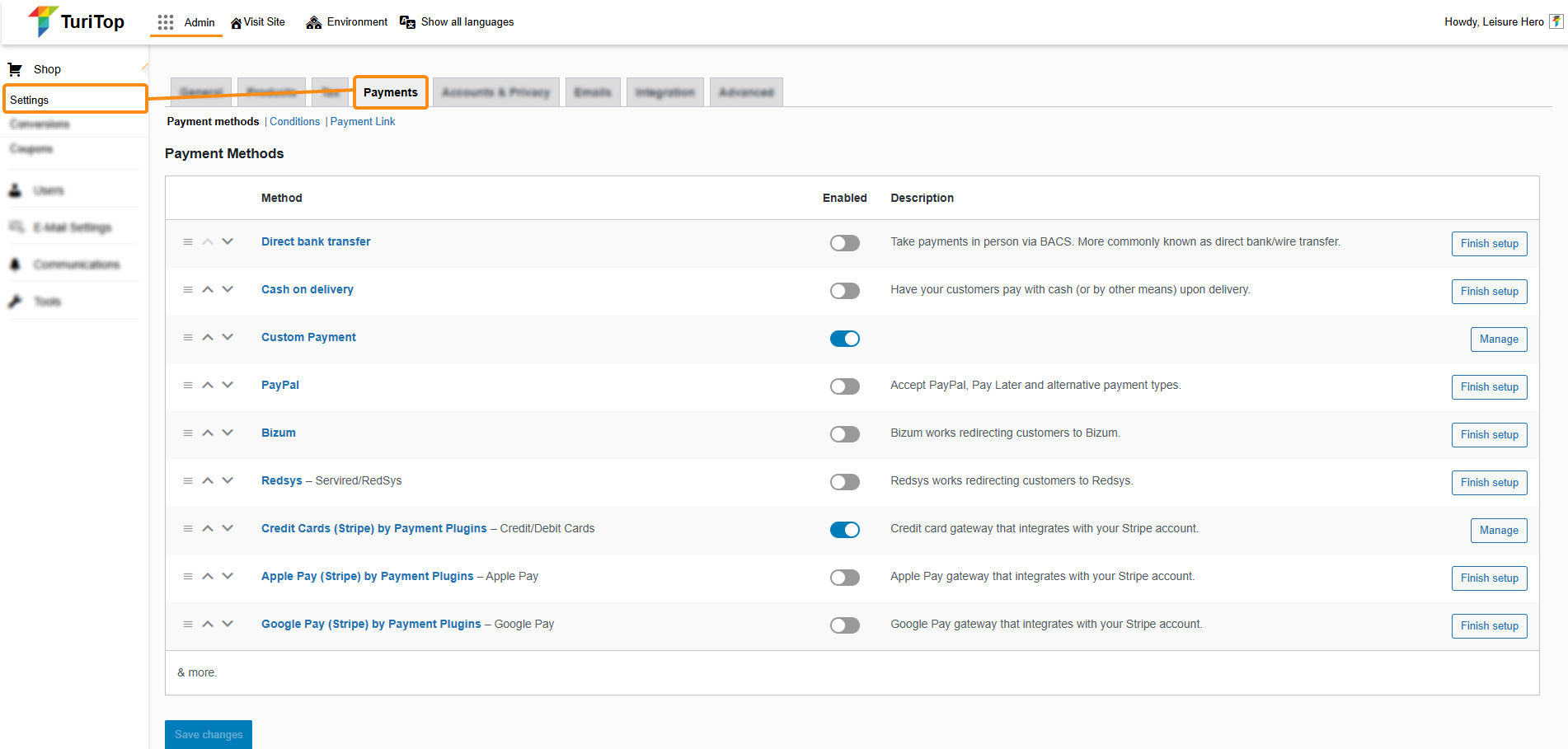 In this section, you can enable, disable, and configure the diverse Payment Methods supported by TuriTop. Check out the Payment Gateways section for specific instructions on how to configure each one of them.