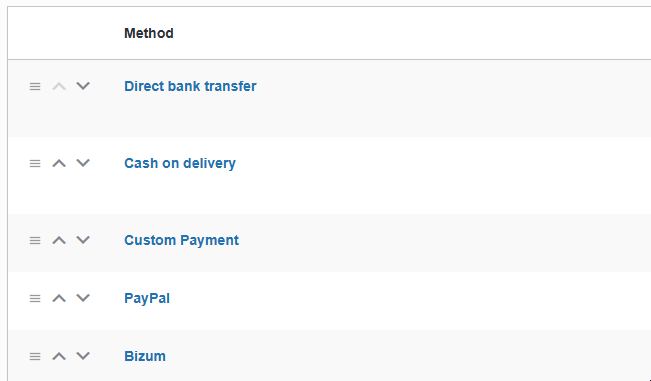 You can rearrange the order of your payment methods using the hamburger and arrow buttons located to the left of each.