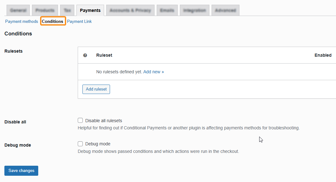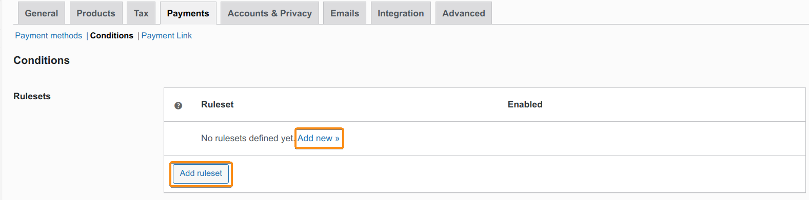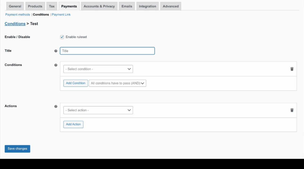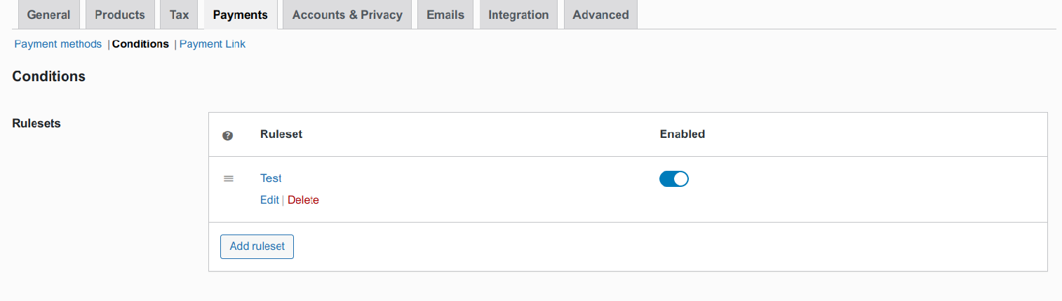 Through the rulesets located in the Conditions tab, you will be able to run actions such as disabling a specific payment method or applying an extra fee when certain conditions are met.