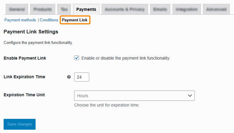 Enable diverse payment methods, set up conditions for them, and configure the payment link.